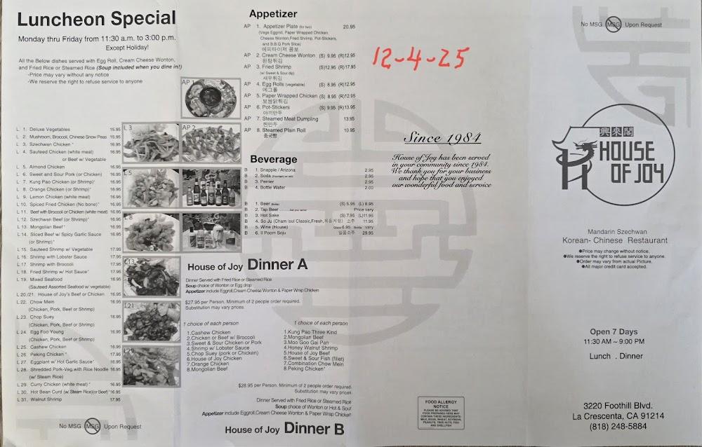 Welcome to House of Joy - La Crescenta, a delightful Korean-style Chinese restaurant located at 3220 Foothill Blvd. Indulge in our vibrant atmosphere while savoring authentic local specialties, featuring vegan options and delectable small plates perfect for sharing. Enjoy a quick lunch or a leisurely dinner in our casual setting, ideal for solo diners and groups alike. Our friendly staff provides fast service, and we offer convenient takeout and delivery. With wheelchair accessibility and ample parking, we ensure a comfortable experience for all. Join us for a memorable meal and discover the joy of our unique culinary offerings!