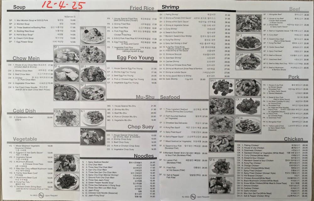 House of Joy presents a diverse menu showcasing expertly crafted dishes. The selection includes noodle dishes, fried rice, and generous portions of meats and vegetables. Highlights include beef with baby bok choy, house special chop suey, and a variety of delicious soups.